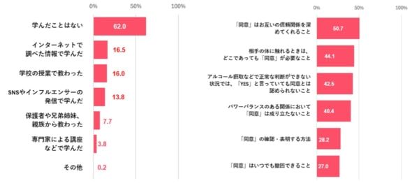 「同意の取り方・伝え方を学んだことがない」と回答した人は全体の62%。なかでも、女性の26〜33歳のグループでは75%にのぼりました。
