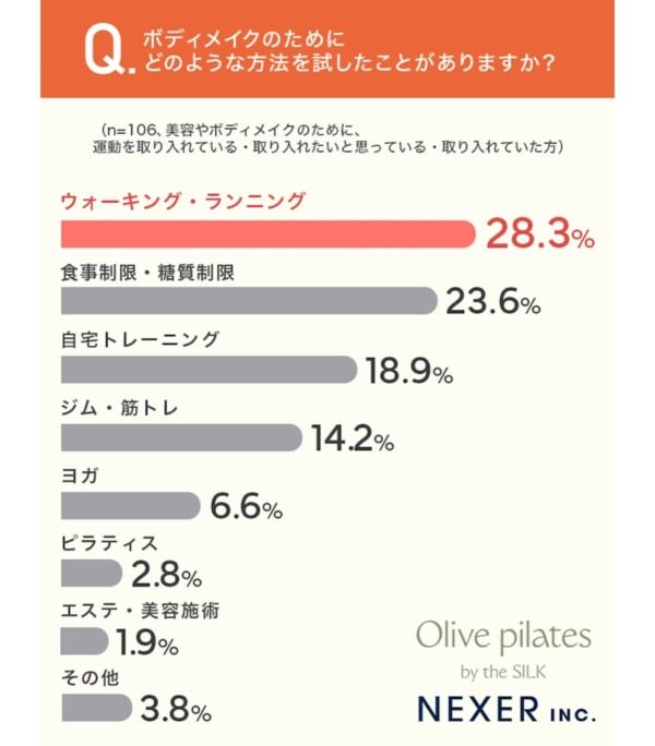 1位は「ウォーキング・ランニング」で28.3%、2位は「食事制限・糖質制限」で23.6%、3位は「自宅トレーニング」で18.9%でした。「ジム・筋トレ」は14.2%、「ヨガ」は6.6%、「ピラティス」は2.8%、「エステ・美容施術」は1.9%です。