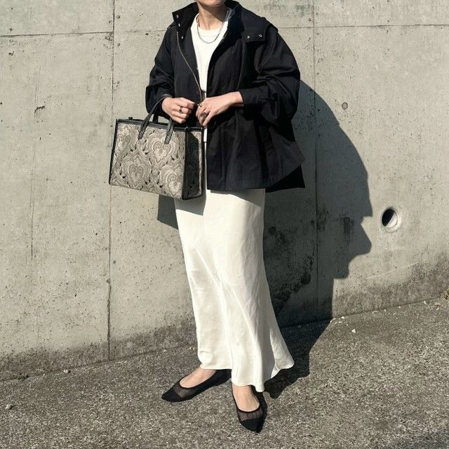 例えば「白のロングスカート」はおすすめ。清潔感たっぷりな色のスカートのおかげできれいめ感がグンとアップします。特にマウンテンパーカーがダークカラーのときは、より白のスカートが映えて素敵ですよ。靴はパンプスを選ぶといっそうクリーンな装いに。