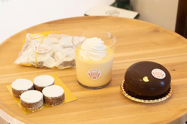「ランブル」ではプリン、砂糖・小麦粉不使用のダックワーズ生地にチョコムースを全体にかける“エクセレント!”、焼き菓子“ポルボロン”という3つのスイーツをロカボ仕様でつくっている。