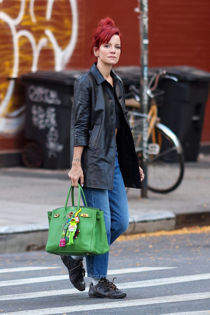 カーミットのヴィンテージキーホルダーや双子のベア、シルバーの星形リングなど個性豊かなチャームをあちこちにつけたリリー・アレンのバーキン バッグ。好きなものを身につける、彼女自身のスタイル理念が表れている。レザージャケットやデニム、ニューバランス×ミュウ ミュウのスニーカーなど、装い自体はシックにまとめて、華やかなバッグを強調して。