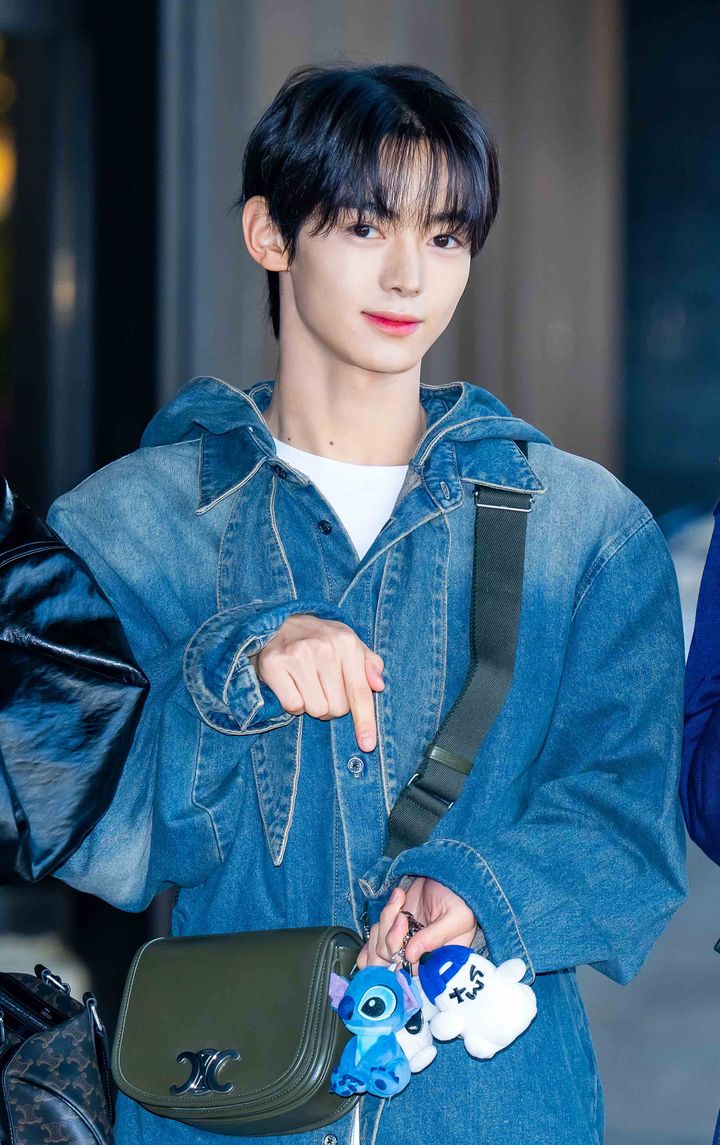 こちらも空港で撮影されたワンカット。TWSのハンジンが指差すその先には、スティッチ、そしてTWSのオリジナルキャラクターが。大ぶりなチャームを複数つけるというのも、また新たなスタイルのひとつ。深いカーキ色のセリーヌのショルダーバッグとのギャップもユニーク。