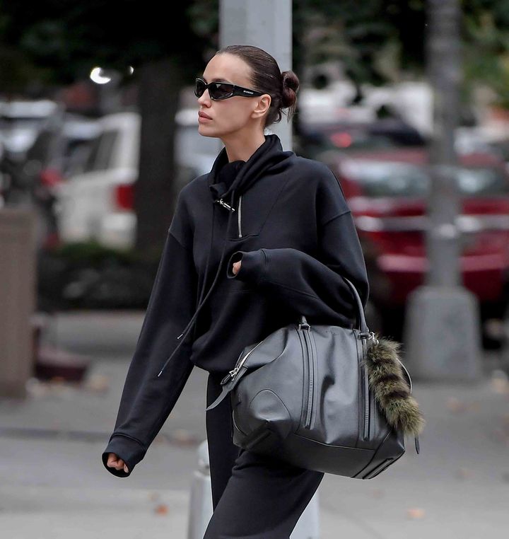2024年のヴィクトリア・シークレットのショーに参加し、話題になったイリーナ。オフランウェイでは、オールブラックのストイックな装いがクール。ジバンシィのスクエアフォルムのバッグにはどこか懐かしい動物のしっぽチャームをつけて、2000年代のムードをMIX! あえて1点づけなのも秀逸だ。