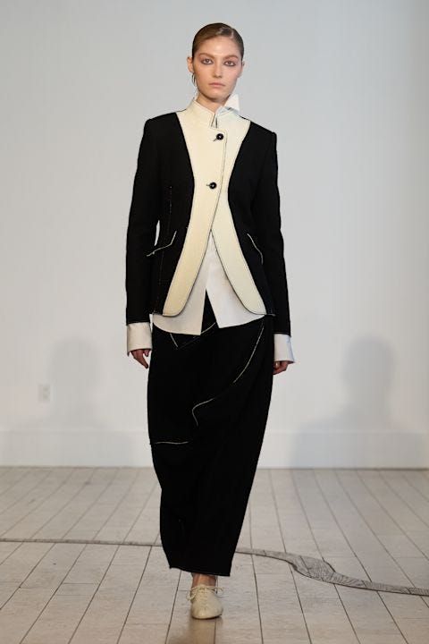 ボタンが主役に! モノクロのスタンドカラージャケットを発表したアシュリンは、あえて白地にブラックの大型ボタンをあしらい、留めたときのシルエット美を強調した。一方でウラ ジョンソンはニットの中央部分にボタンを配置し、あえて最後の3つを開けて、シャープなウエストマークを演出した。
