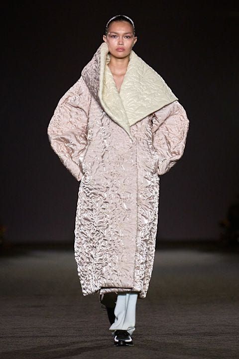 一枚羽織るだけでインパクト大! ステートメントアウターは、ダークカラーに偏りがちな秋冬シーズンに重宝するに違いない。プラバル グルンは、厚みのあるピンクとホワイトのバイカラーコートを発表。全体にシュリンク加工が施され、アートな曲線を艶やかなサテン地が強調している。まるでブランケットのような重みのあるシルエットは、防寒とおしゃれ、両方を叶える1着。また、トリー バーチからは、自然から着想を得た有機的なプリントのウールコートが登場。丸みを帯びたシルエットで、ドレスアップシーンでも活躍しそう。