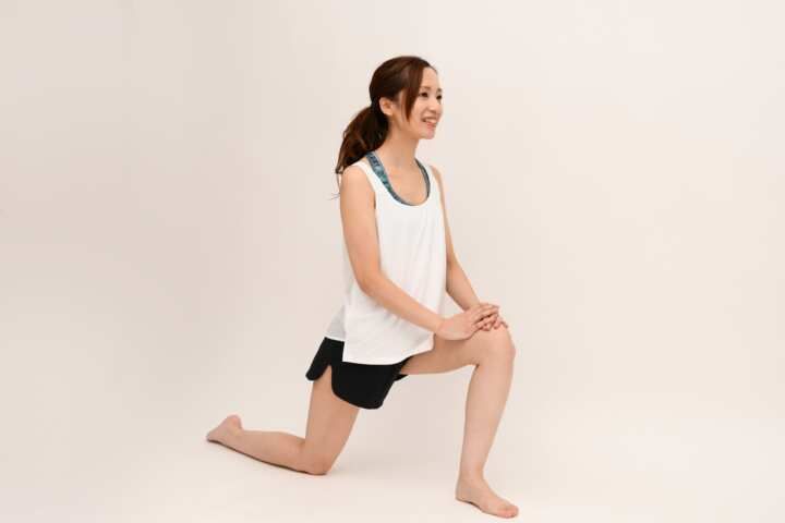 片膝を床につき、もう片方の足を前に出して膝を90度に曲げます。骨盤をまっすぐ保ったまま体をゆっくり前に移動させ、後ろ脚の付け根が伸びる位置で30秒キープします。反対側も同様に行います。