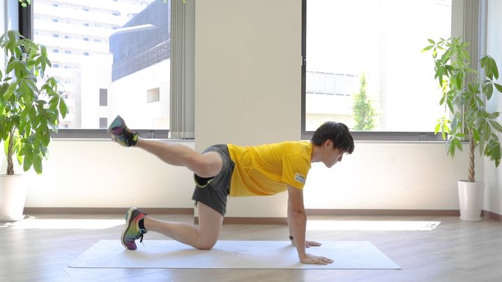 四つ這いになり、片膝を横に持ち上げます。腰を傾けず、股関節から太ももを外に開くようにゆっくり10回行います。左右それぞれ2セット行います。