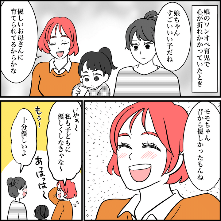 友人「娘ちゃんすごくいい子だね。優しいお母さんに育てられているからかな。モモちゃん、昔から優しかったもんね!