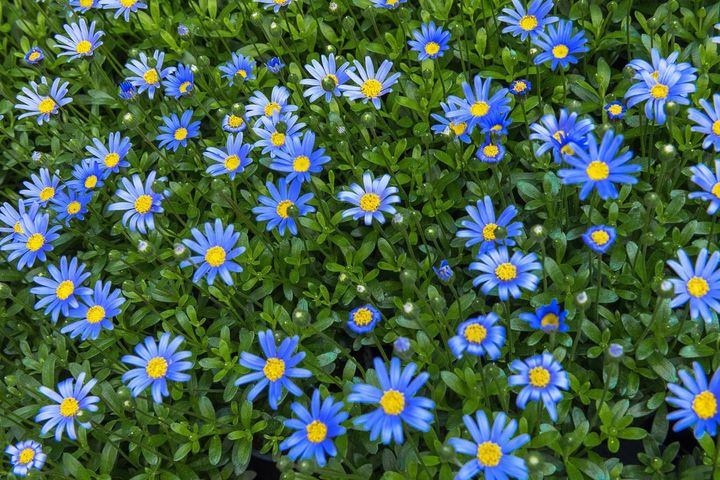 パッチリ開く花が愛らしいものの、日ざしがないと花弁は外に巻きます。熱帯アフリカ原産の多年草ですが、暑さ寒さにあまり強くないため、一年草扱いになることも。学名のフェリシアで呼ばれるのは一年草のフェリシア・ヘテロフィラで、斑入り葉の品種なども人気です。
