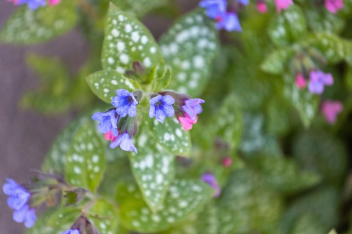 寒さに強い多年草で霜や凍結にも傷むことなく、早春から咲き出します。花後も白い斑点の入る葉がユニークな存在で、リーフプランツとして重宝。濃い青花が人気ですが、咲きはじめはピンクで徐々に青色に変わるタイプもあります。暑さにやや弱いため日陰で育てると夏越ししやすい。