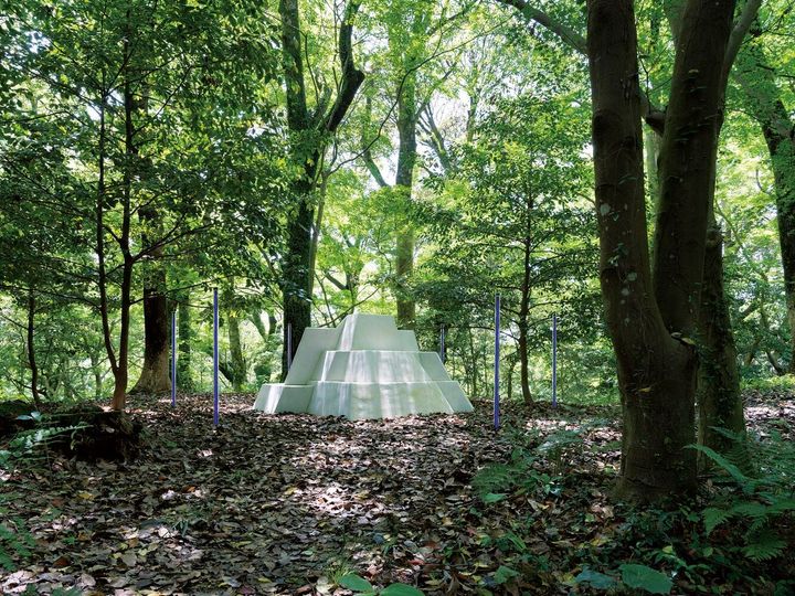 森林の中に現れる彫刻作品は、田島美加の《エコー/ナルキッソス(太宰府)》(2022)。 COURTESY OF TARO NASU. © MIKA TAJIMA, 2021, 2022. PHOTO BY YASUSHI ICHIKAWA