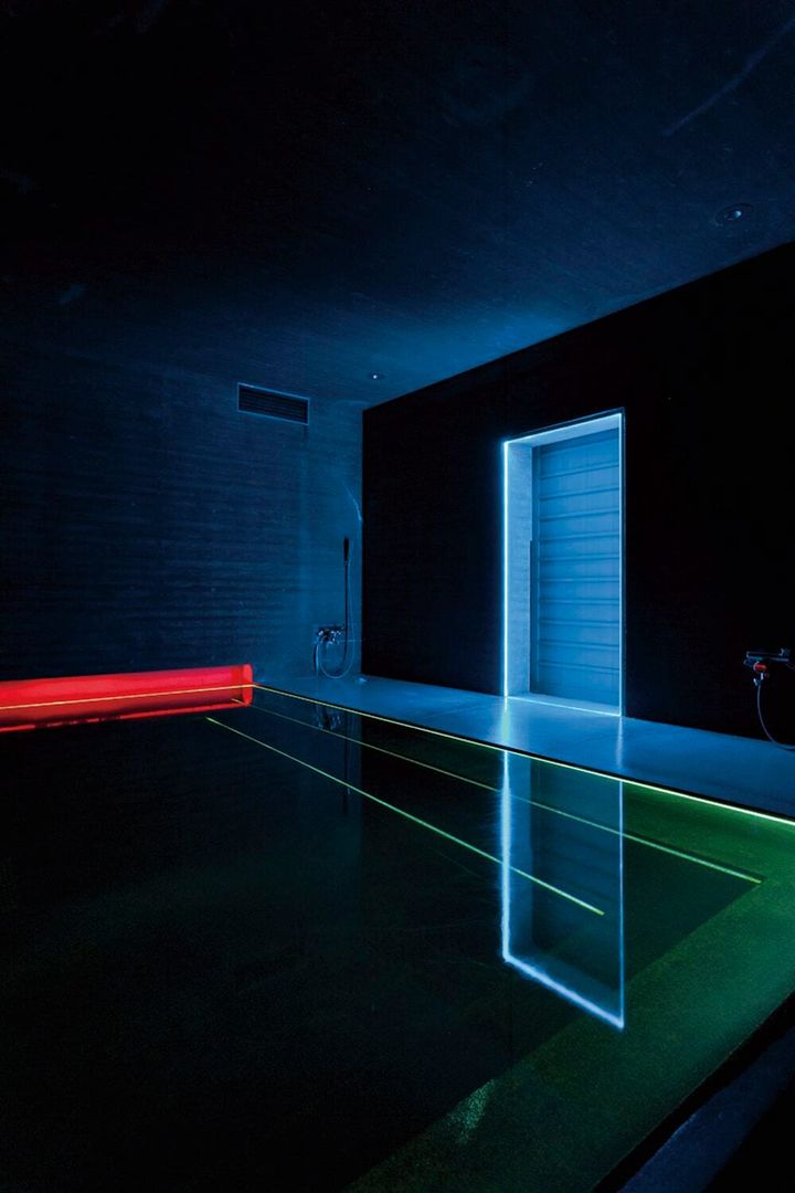2階の部屋《アウトサイドイン》では、天窓から空の移ろいを眺めることができ、日の入りと日の出の時間帯にはライトプログラムも。ガラスなどの遮蔽物がない天窓からは、空そのものをダイレクトに感じられるのも大きな魅力だ。「室内の光として、私は水の光、浴槽の水の中の光を見下ろすようにしたいと思った」とタレルが語る浴室は、光ファイバーにより水中に光が満たされ、湯船に浸かることで光そのものに触れられる。光を知覚し、自己の内面と向き合う。一種の瞑想体験も得られるはずだ。