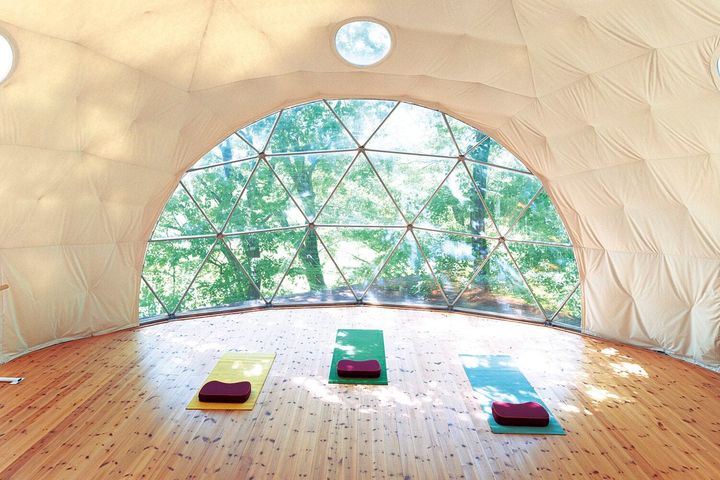 オーディオシステムと床座のクッションを備えた円形のスペースは、ヨガや瞑想、ワークショップに最適。 FUMIHIKO OKI, 2024