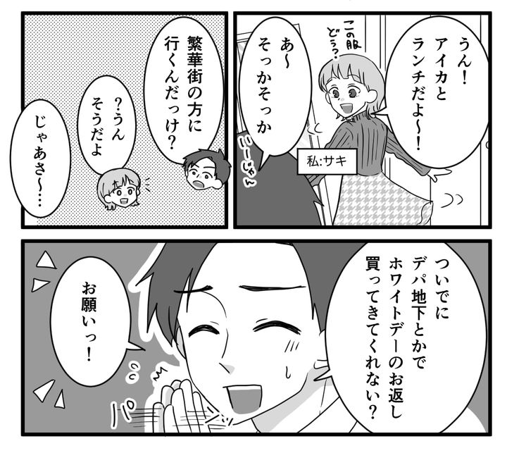 私はサキ(30代前半)。夫のジュンセイ(30代前半)とは学生のころからの付き合い。ジュンセイはノリがよくて面倒見もいいので、学生時代からバレンタインデーはたくさんのチョコをもらっていました。結婚する前は、義母にホワイトデーのお返しの準備を頼んでいたようですが、結婚してからは私が頼まれることに。けれど、私がなぜホワイトデーのプレゼントを買いに行かなければならないのでしょうか? このあと同級生のアイカとランチなので、相談してみようと思っています。