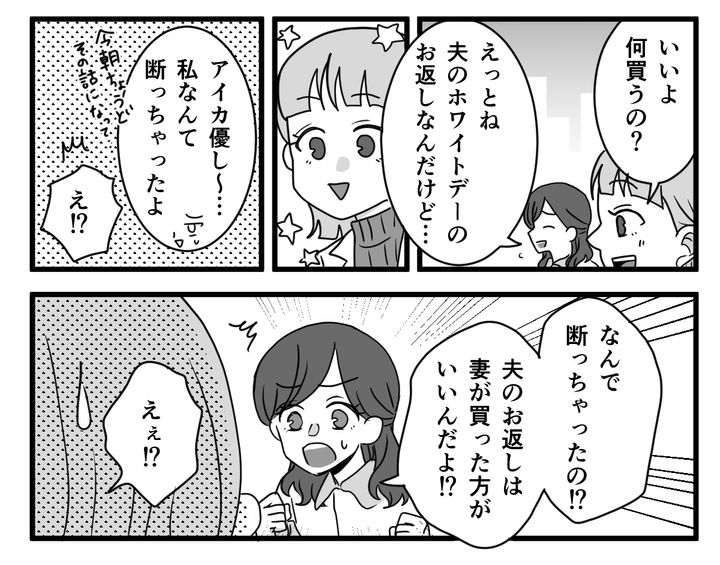 しかし同級生のアイカは、今から旦那さんのホワイトデーのお返しを買いに行くと言います。