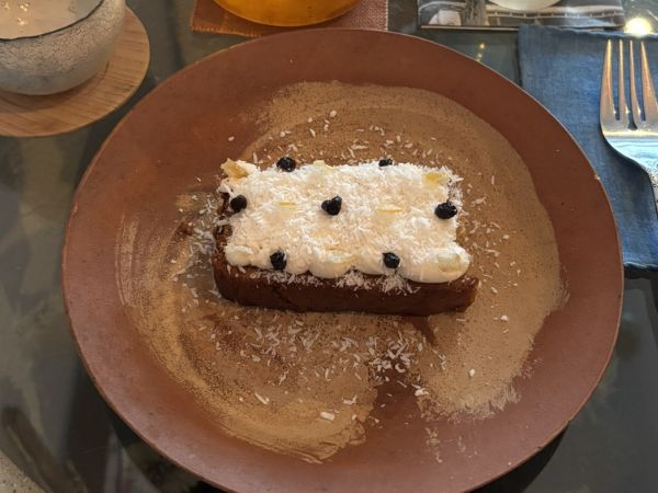 たっぷりの白いクリームとココナッツの上に、アクセントでレモンピールとドライカシスがトッピングされています。
