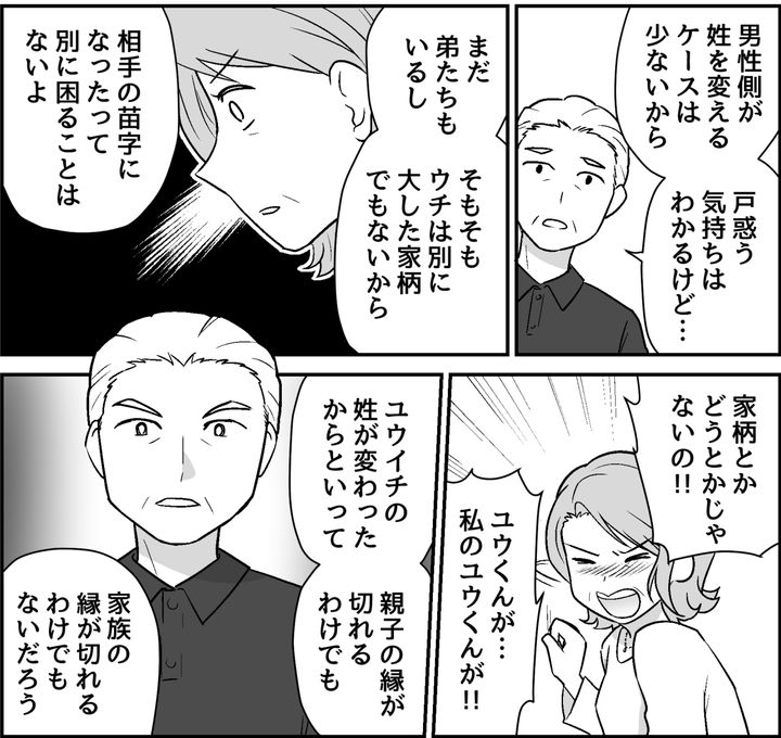 夫はユウイチの結婚に賛成しているし、ユウイチがツムギさんの姓になることも前向きに受け入れているようです。