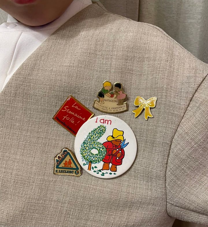 胸元にはヴィンテージの缶バッチやピンブローチで遊び心をプラス♡