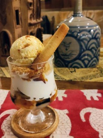 上からの図。バニラアイスクリームに何か工夫がありますが(茶色が混ざっていますよね)おいしくて夢中で食べてしまい、良く考えずに完食してしまいました。どなたか食べに行ってこれの正体を教えてくれませんか~。
