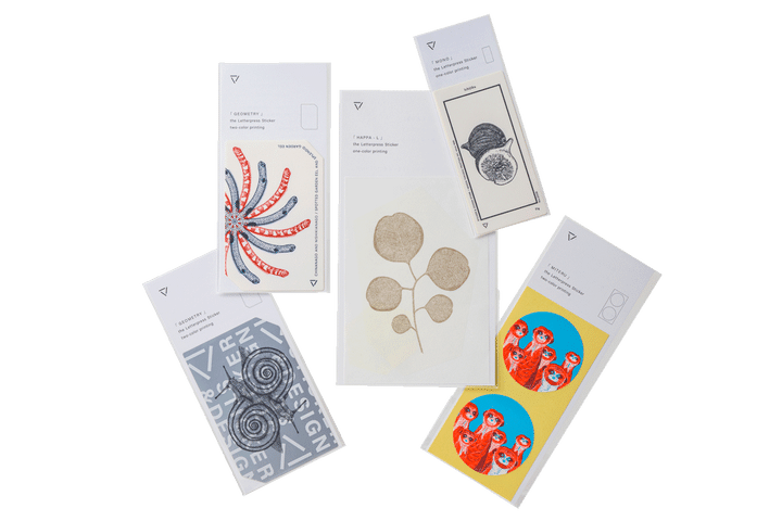 Letterpress sticker  左から、「GEOMETRY-SILVER」ミスジマイマイ H6.2×W9.5cm、「GEOMETRY」チンアナゴ&ニシキアナゴ H6.2×W9.5cm、「HAPPA-L」ユーカリ H8×W12cm、「TONIKAKU」イチジク H4.8×W8cm、「MITERU」ミーアキャット φ5cm 各500円