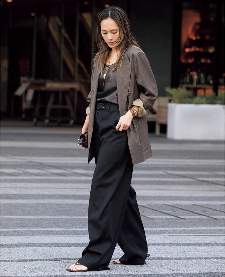 「マニッシュなダブルブレストジャケットは、サテンのキャミソールを合わせて女っぽく着たい。パンツは太めでモードなシルエットをセレクト、トータルバランス的にハンサムさもキープ。トングサンダルでヌケも意識しました」