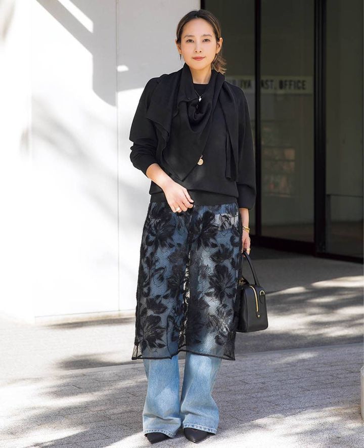 「今年はデコラティブなスタイルが気になっています。そしてやっぱり旬のレースが着たい!  MY定番のデニムに、立体感のあるフラワーモチーフのレースドレスを重ねて、レディライクに落とし込みました」