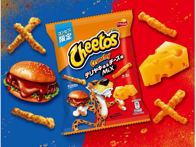 本物のチーズを使った濃厚な味わいの「チーズ味」と濃厚でやみつきな「テリヤキ味」を1袋にミックスしました。単体でも十分濃厚な味わいですが、2つの組み合わせで一段階上のやみつき感が楽しめます。さらに、2つの味を一緒に食べると「テリヤキチーズバーガー味」に味わいが変化し、「チートス」の遊び心が感じられます。ザクザクッッ!!とした食べ応えのある食感と一段階上のやみつきになる味わいは、おやつとしてはもちろんのこと、ストレス発散したい人や気分転換をしたい人にもオススメの商品です。 パッケージの背景色には赤と青の2色を使用し、ミックス感を打ち出しています。目で見ても楽しい「チートス」の世界観をお楽しみください。