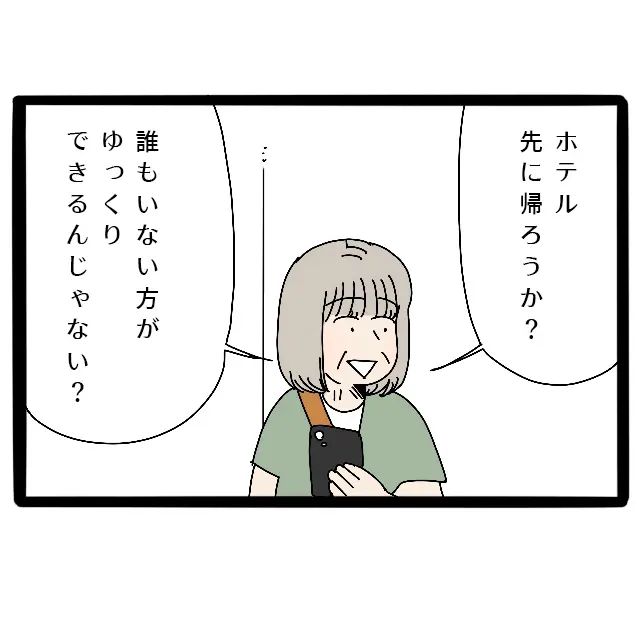 先にホテルに帰ることを提案してくれるも義母と同室だと聞いて言葉を失う【義両親との同室旅行】