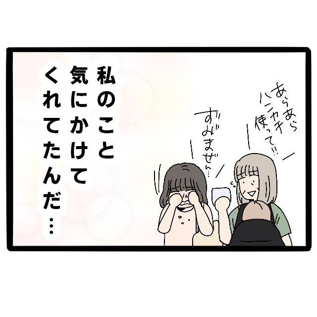 私のことを気にかけてくれていたことが嬉しくて嬉しくて・・私はしばらく涙が止まりませんでした。私が泣いている間も、さよさんは自分のハンカチを貸してくれたりずっと優しく声をかけてくれました。
