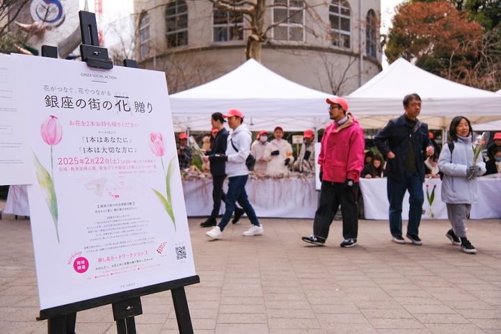 4回目となる今年も、銀座を訪れた人々に2本の花が無償で手渡される。用意されるのは、能登半島地震からの復興途上にある新潟県、石川県、富山県で生産された新鮮なチューリップ。花を贈るという行為を通じて、生産地への支援と応援の気持ちをつなぐ取り組みでもある。
