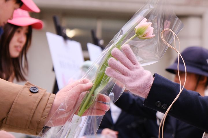手渡された一輪がどこかで飾られ、また別の誰かへと気持ちを運んでいく──。春の銀座で、花がつなぐアクションに加わってみては。