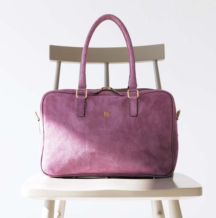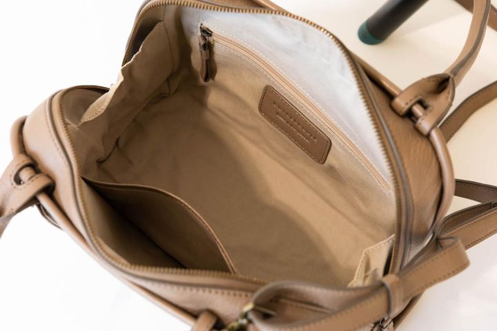 山羊革スエード素材。淡い色調が春夏の着こなしにも映え、一年中活躍します。A4サイズ対応で、ショルダーストラップつきなので習い事や仕事にも。