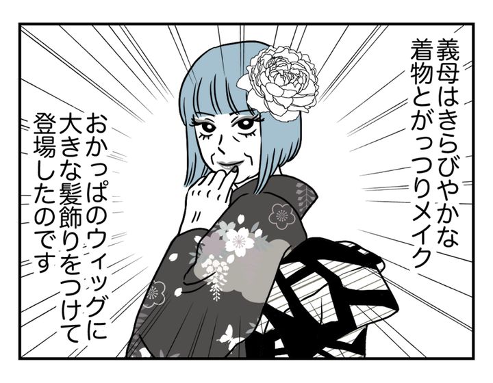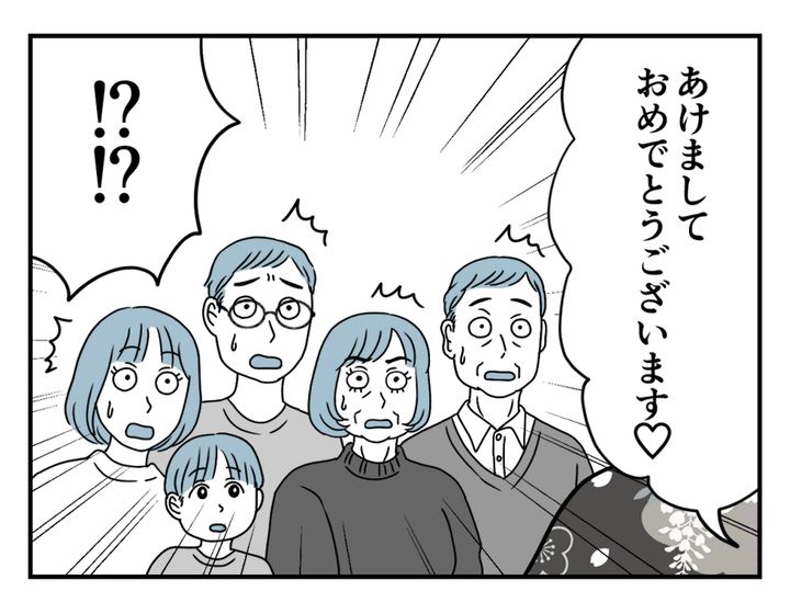 久しぶりに会ったお義母さんの姿があまりに強烈だったので、シュンさんもスミレさんも言葉を失っているようです。明るく新年の挨拶をするお義母さん。え……? お義母さんには「プロの着付けやヘアメイクでないと人前に出ない」というプライドがあったのでは。カヲルさんが呼びに行く前は普通の格好だったはずです。なのにその姿は一体……? 新年早々、お義父さんもカヲルさんもシュンさんもスミレさんも、全員が目を丸くして驚いてしまったようです。