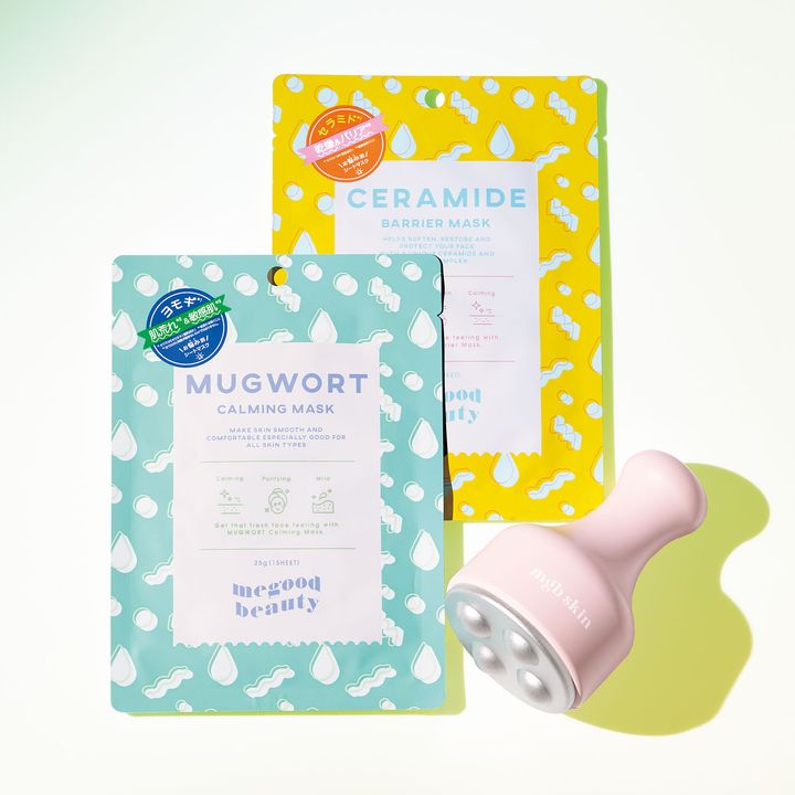 上:角層の潤いに必須なセラミドをたっぷり。CERA MIDE BARRIER MASK 、下:30種類の植物成分をブレンド。揺らぎ肌を鎮静するマスク。MUGWORT CAL MING MASK 各25gx1枚 各¥350、右下:顔にもボディにも使える多機能かっさ。mgb skin SKIN COOLER ¥2,200(すべてダイヤコーポレーション)