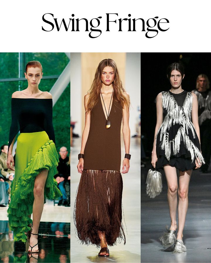 軽やかさと躍動感を生み出すフリンジが継続して人気。ドラマチックに揺れ、視線を集めます。極細のレザーからスパンコールやメタリックまで、素材の種類も豊富。フェザーの質感を職人技や新技術で再現した装飾も見られ、エアリーな浮遊感を演出します。