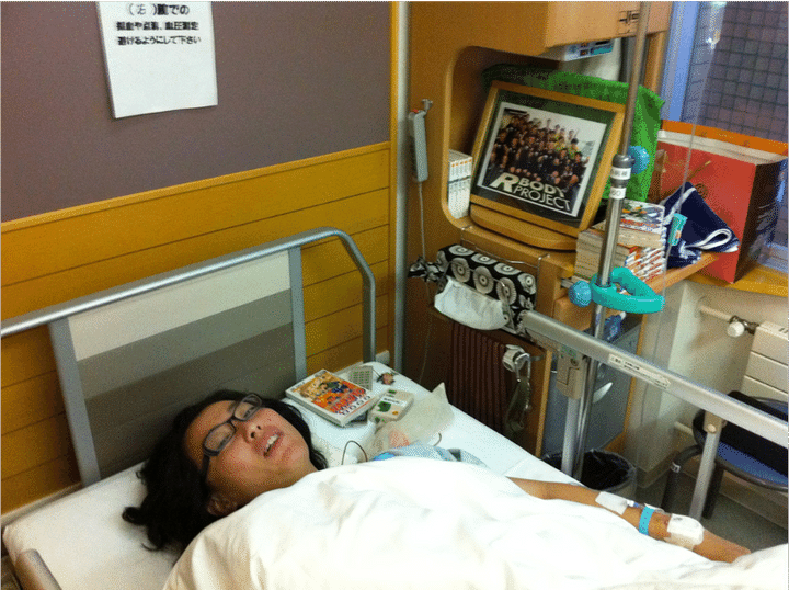 2011年、闘病中の池田さんの姿。枕元には、コンディショニングトレーニング施設の仲間たちの写真 ご本人提供