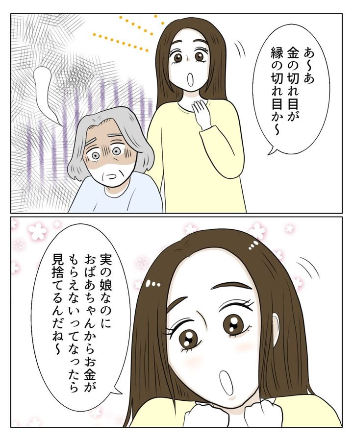 するとそこにやって来た真矢さんが、「あーあ、金の切れ目が縁の切れ目か~」とチクリ。呆然として何も言えない義母に、「実の娘なのに、おばあちゃんからお金がもらえないってなったら見捨てるんだね~」と平然と言いました。
