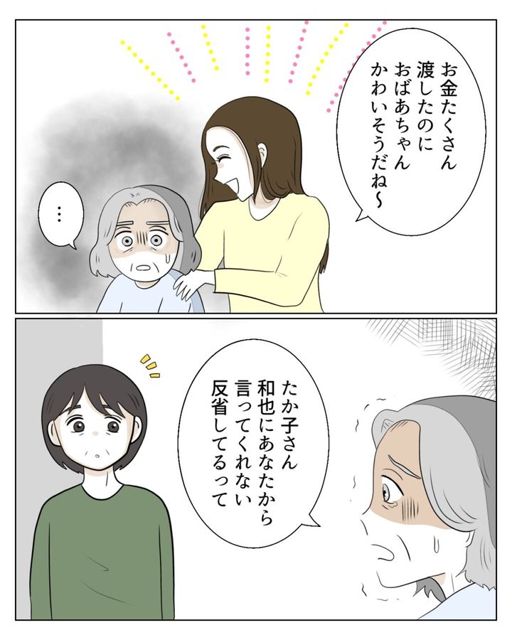 「お金たくさん渡したのに、おばあちゃんかわいそうだね~」真矢さんに笑いながらそう言われ言葉を失う義母は、「たか子さん、和也にあなたから言ってくれない。反省してるって」と懇願するようにたか子さんに言ったのでした。