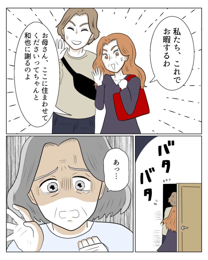 「私たち、これでお暇するわ。お母さん、ここに住まわせてくださいってちゃんと和也に謝るのよ」エミさんとタクマさんは揃ってそう言うと、そそくさと家から出て行ってしまい、「あっ・・」義母は呼び止める力もなくうなだれました。