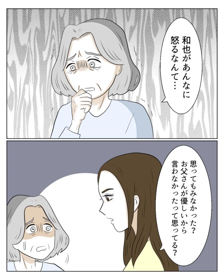 「和也があんなに怒るなんて・・」と衝撃を受ける義母に、「思ってもみなかった?お父さんが優しいから言わなかったって思ってる?」真矢さんが義母にそう言った後、