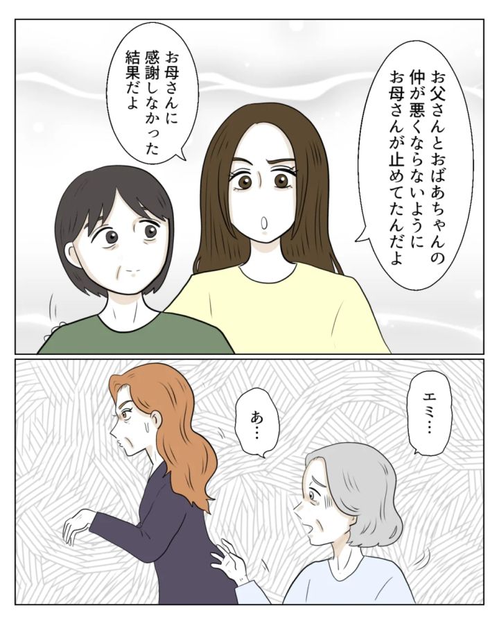 「お父さんとおばあちゃんの仲が悪くならないように、お母さんが止めてたんだよ。お母さんに感謝しなかった結果だよ」と真矢さんはお母さんに寄り添いながらそう言いました。するとこそこそと帰ろうとするエミさんの姿が。「エミ・・あ・・」義母がそう言って呼び止めると、