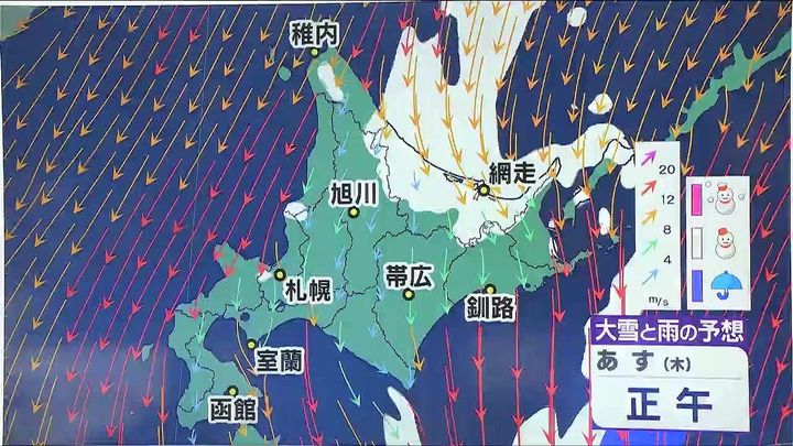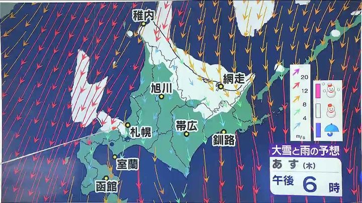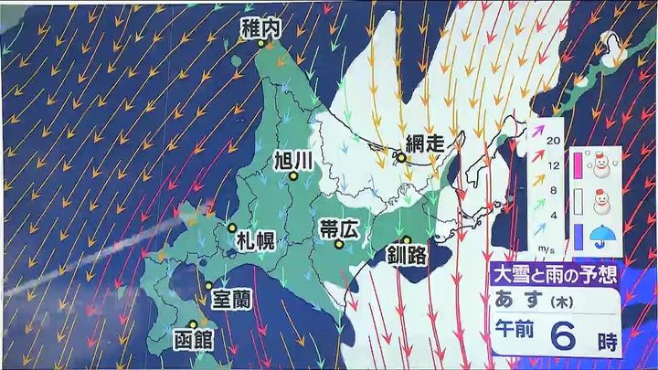 あす午後になると後志地方や札幌周辺でも雪の降る時間がありそうです。あす日中以降は全道的に北風が10メートル前後と強まるでしょう。