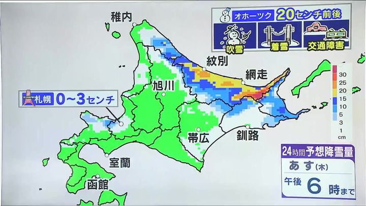 釧路や根室は午前を中心に雪が降り、ふぶく時間があるでしょう。オホーツク海側は朝から雪や風が強まり、20センチ前後の湿った雪が降りそうです。外出には防水の効いた靴や上着が必要です。