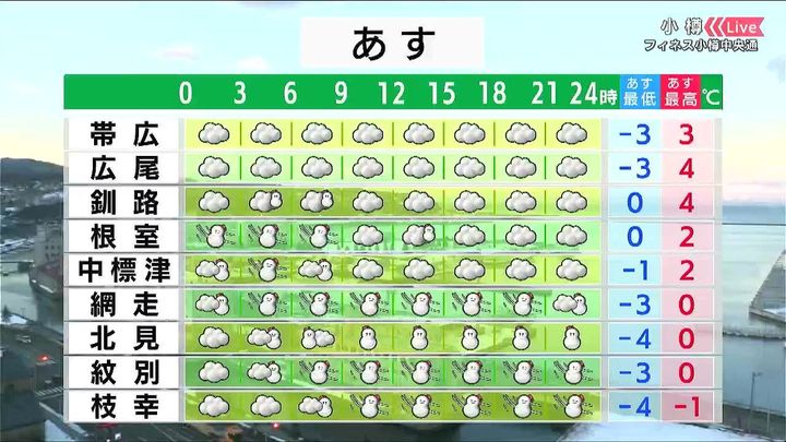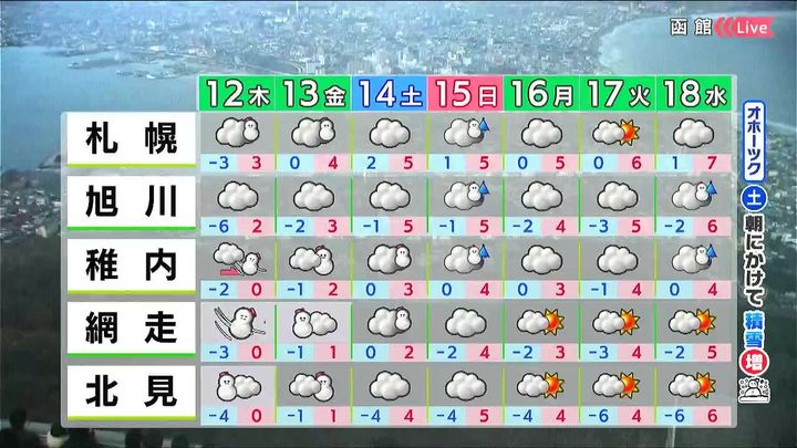 全道的に北風がやや強く、オホーツク海側を中心に雪が降ります。気温はきょう11日(水)と同じくらいですが、風の影響で体感はきょうより寒いでしょう。稚内やオホーツク海側の最高気温は0度です。