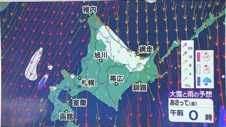 オホーツク海側や宗谷南部で、土曜の朝にかけて大雪になるおそれがあります。札幌や稚内は大雪にはなりませんが、金曜もふぶく時間があるでしょう。来週は割合穏やかで気温は5度くらいまで上がります。