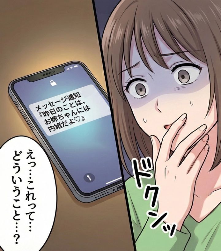 そんなある日のこと。机の上に置いてあった彼のスマホにメッセージの通知が表示されました。ふと視線を落とすと、そこには「昨日のことは、お姉ちゃんには内緒だよ♡」という妹からの言葉がはっきりと映っていたのです。