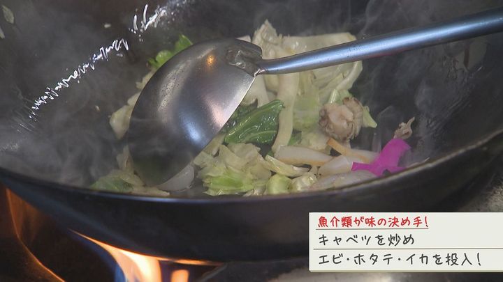 最初にキャベツを炒めてからエビ、ホタテ、イカを投入!