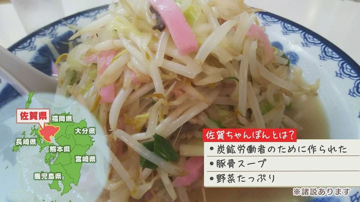 佐賀ちゃんぽんとは…九州、佐賀県で炭鉱労働者のためにつくられたという説があり、豚骨スープがベースで野菜をたっぷり使っているのが特長だそう。