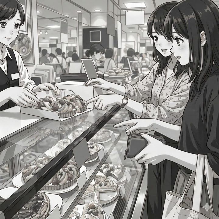 「あ!見て見て!あのフルーツタルト、めっちゃ美味しそう!しかも半額になってるよ!」