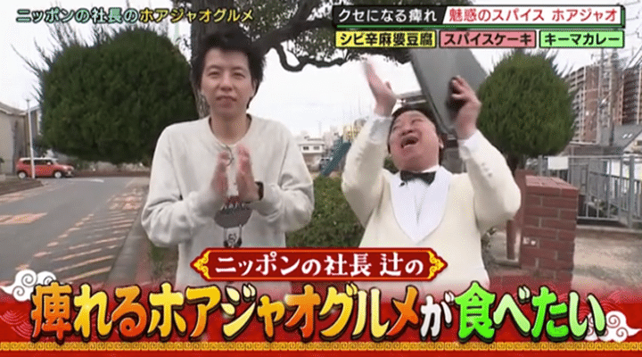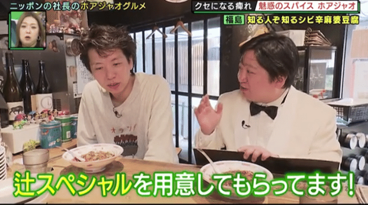 ニッポンの社長・辻の痺れるホアジャオグルメが食べたい!」は、ニッポンの社長の辻が大好きな「ホアジャオ(花椒)」を使った絶品メニューをひたすら味わうグルメロケ! 花椒とは、四川料理には欠かせない中国原産のスパイス。痺れるような辛さとさわやかな香りが特徴で、担々麺や麻婆豆腐をきっかけにハマったという辻は、今や立ち食いうどんにもこっそりかけるほど花椒の虜(とりこ)らしい。そこで今回は、進行役を務める相方・ケツの案内で、花椒グルメが自慢の大阪の名店へ! 料理人がセンスとアイデアを駆使した花椒料理を味わうほか、辻のために作られたメニューにない花椒グルメ“辻スペシャル”を堪能する。